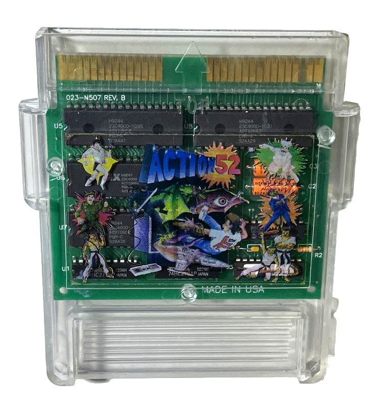 NOTE: A large number of games on the Action 52 multi-cart have different official titles compared to the titles shown on the game selection menu. If the two titles match, you will simply see the name of the game in this list. If the two titles do NOT match, the official game name is shown normally with the menu title shown (in parentheses). There's also a couple instances where the game has a menu title but NOT an official title!
