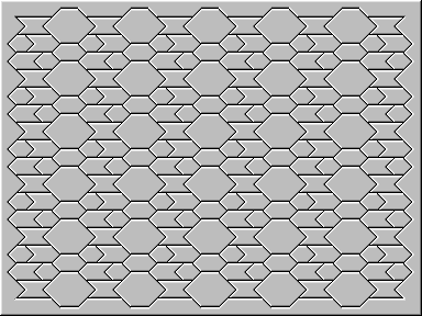 | This grid-like pattern features hexagons with their sides pointing outward, alternating with hexagons that have their sides pointing inward. It is a highly deceptive pattern that takes a lot of getting used to. The inward hexagons each touch 8 others and the outward hexagons each touch 4. |